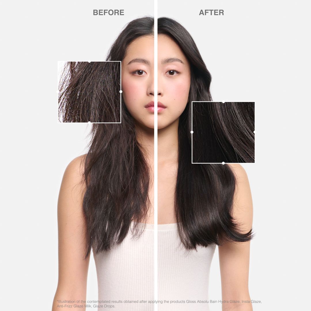 Its high foaming gel-like formula, cleanses scalp and fibre surface to reveal an ultimate shine. Smooths hair cuticles to create an ultra-smooth surface. The fragrance is an unexpected haute-couture blend of fusing citrus notes, with luxury floral bouquet signature. A mix of hair care technicity and fine-fragrance artistry for an ultra-sensorial experience. Know the secret of shine and smoothness? Cleanliness + Care + Fibre Alignment. Thus, pair Bain Hydra-Glaze with other products from the Gloss Absolu range, like Insta Glaze for extra-glossy results. Bottle made using recycled plastic excluding cap, colourants and additives.