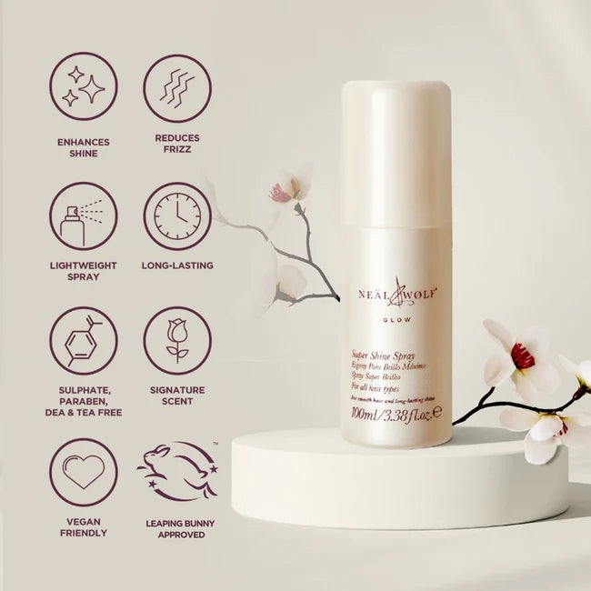 Neal & Wolf GLOW Super Shine Spray is a light-weight spray that adds deep, lasting shine. Whether you’re adding the final touch to a sleek style or reviving dull, dry ends, this non-greasy shine spray instantly transforms the look and feel of your hair.