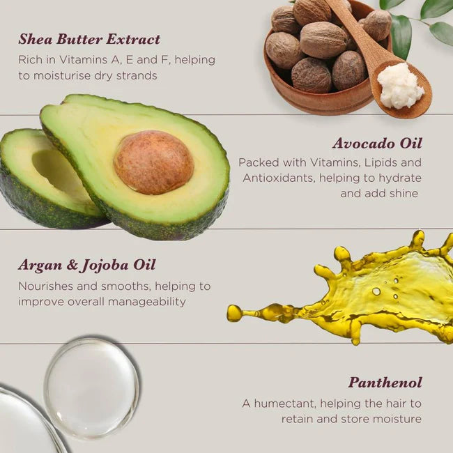 A moisture-rich formula with Shea Butter, Avocado, Jojoba, and Argan Oils to hydrate dry hair, reduce frizz, and boost shine and manageability.